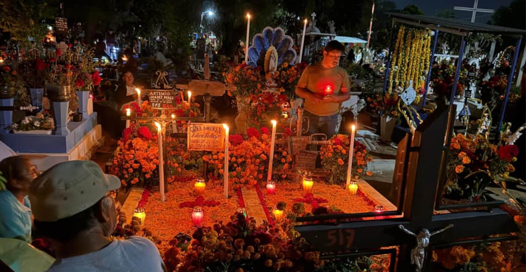 Veladas en los panteones: familias enteras se reúnen en cementerios como Xoxocotlán o Atzompa, donde entre velas, música y comida comparten con sus seres queridos ya fallecidos.