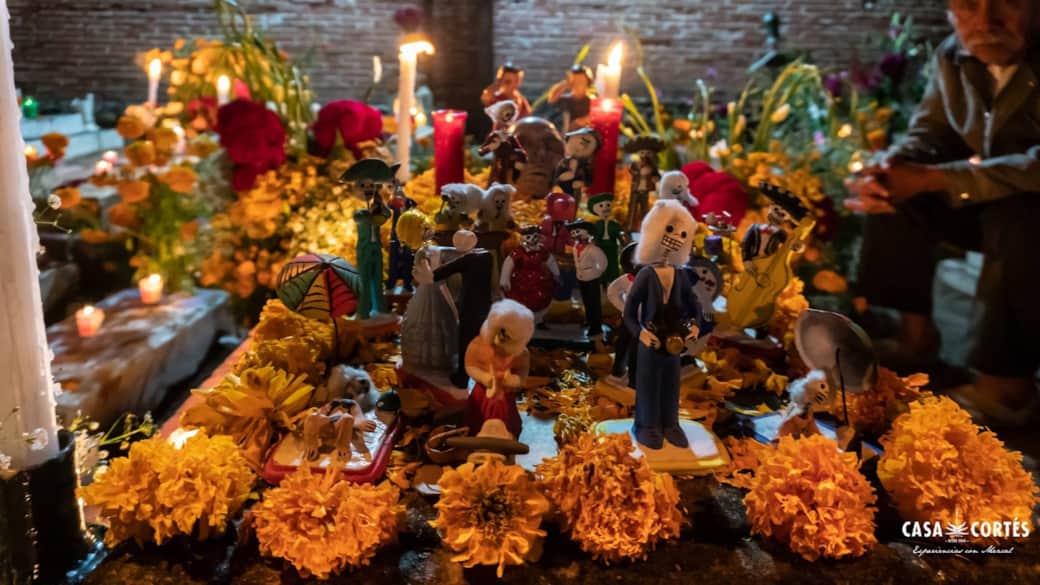 Altares y ofrendas: en cada casa y negocio encontrarás mesas decoradas con flores de cempasúchil, velas, copal, fotografías y platillos típicos como mole, pan de muerto y mezcal.